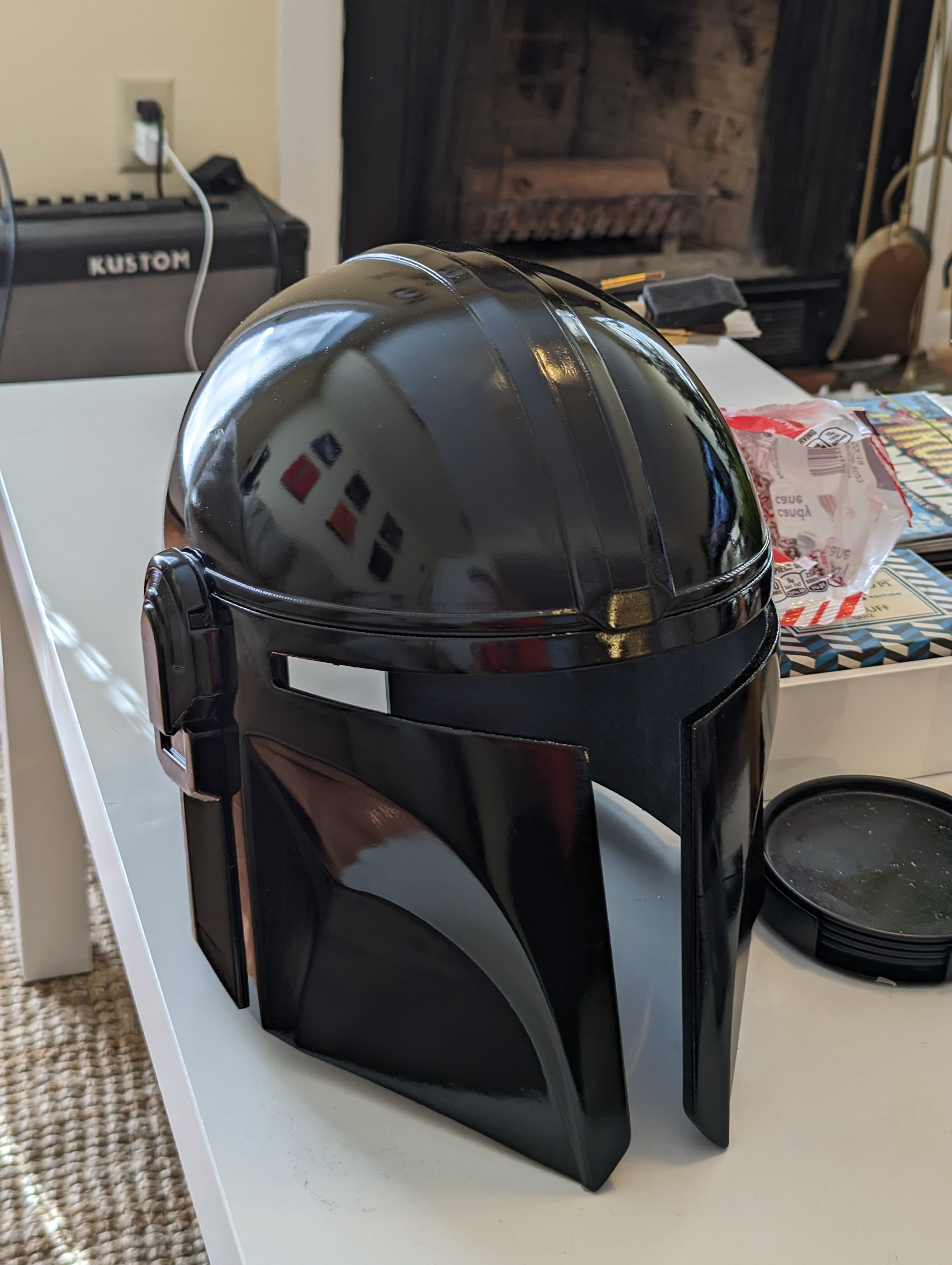 The Mandalorian helmet is one that is incredibly difficult to replicate. The smooth, uninterrupted curvature of the design demands incredible attention to detail for finishing work. After printing in one piece on a modified CR-10S, the sanding and finishing process took the majority of the production time. After wet sanding and a coating of gloss black, the helmet was given a treatment of graphite polish from a powder to create the deep, dark metallic look as seen in the TV series.